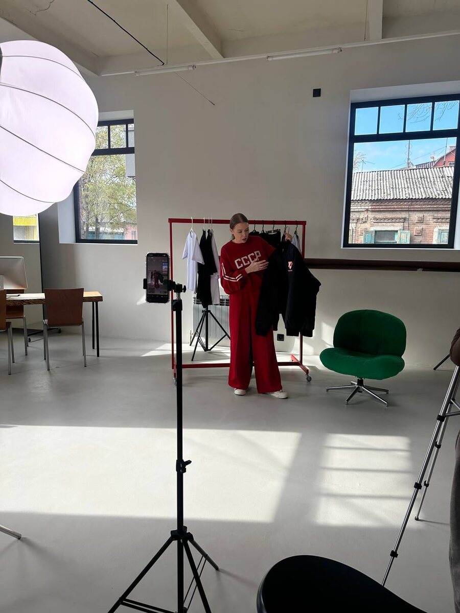Закулисье Dnk На Анне Дмитриевне: ✔️ Свитшот СССР красный ✔️ Брюки палаццо с лампасами