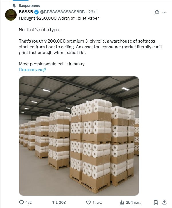 Это примерно 200 000 рулонов трёхслойной премиальной бумаги — целый склад мягкости от пола до потолка. Актив, который потребительский рынок буквально не успевает печатать во время паники.