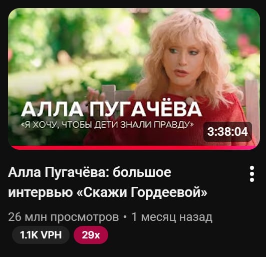 💓Одно из самых просматриваемых интервью русского YouTube — разговор Екатерины Гордеевой с Аллой Пугачёвой: ~26 млн просмотров
