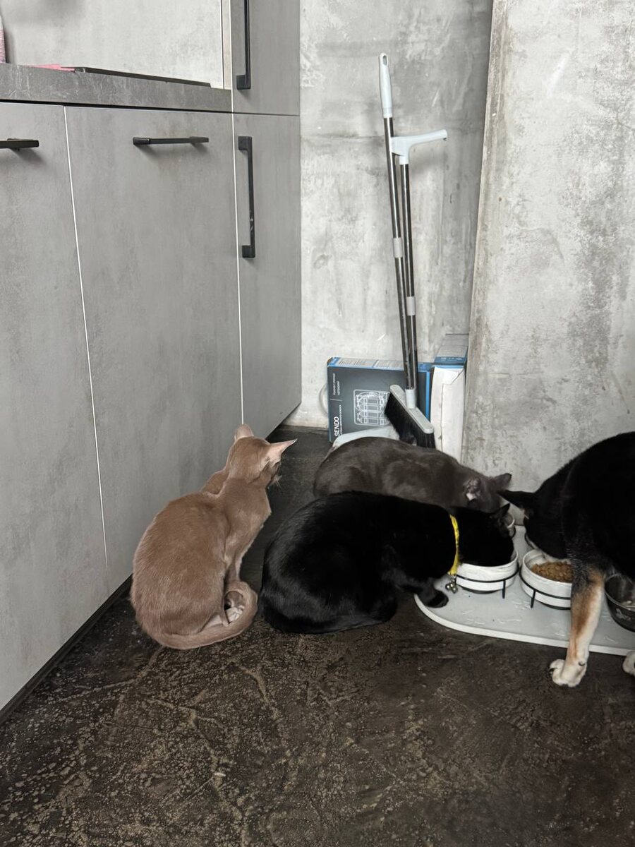 Гриня освоил команду «нельзя» на 5. Менее, чем за неделю, а точнее за 5 дней. Раньше он быстро не жуя заглатывал свою порцию и в наглую лез остальным в миски. Его натиску никто не мог противостоять и Диша с Шаманом вынужденно ретировались, оставаясь полуголодными. Я вспомнила, как мамы кошки воспитывают своих котят и применила. Методичность не заставила ждать результатов. Собственно сообразил Гриня сразу. Но рефлекс на отъем еды был очень силён. И мне приходилось караулить рядом во время еды, пока старшие наедятся. И останавливать Гриню, прижимая его к полу за шеечку и повторяя решительное «нельзя». И вот вам результат. Сидит ждет теперь, не отгоняя от мисок своих визави. Очень умный и сообразительный котик.