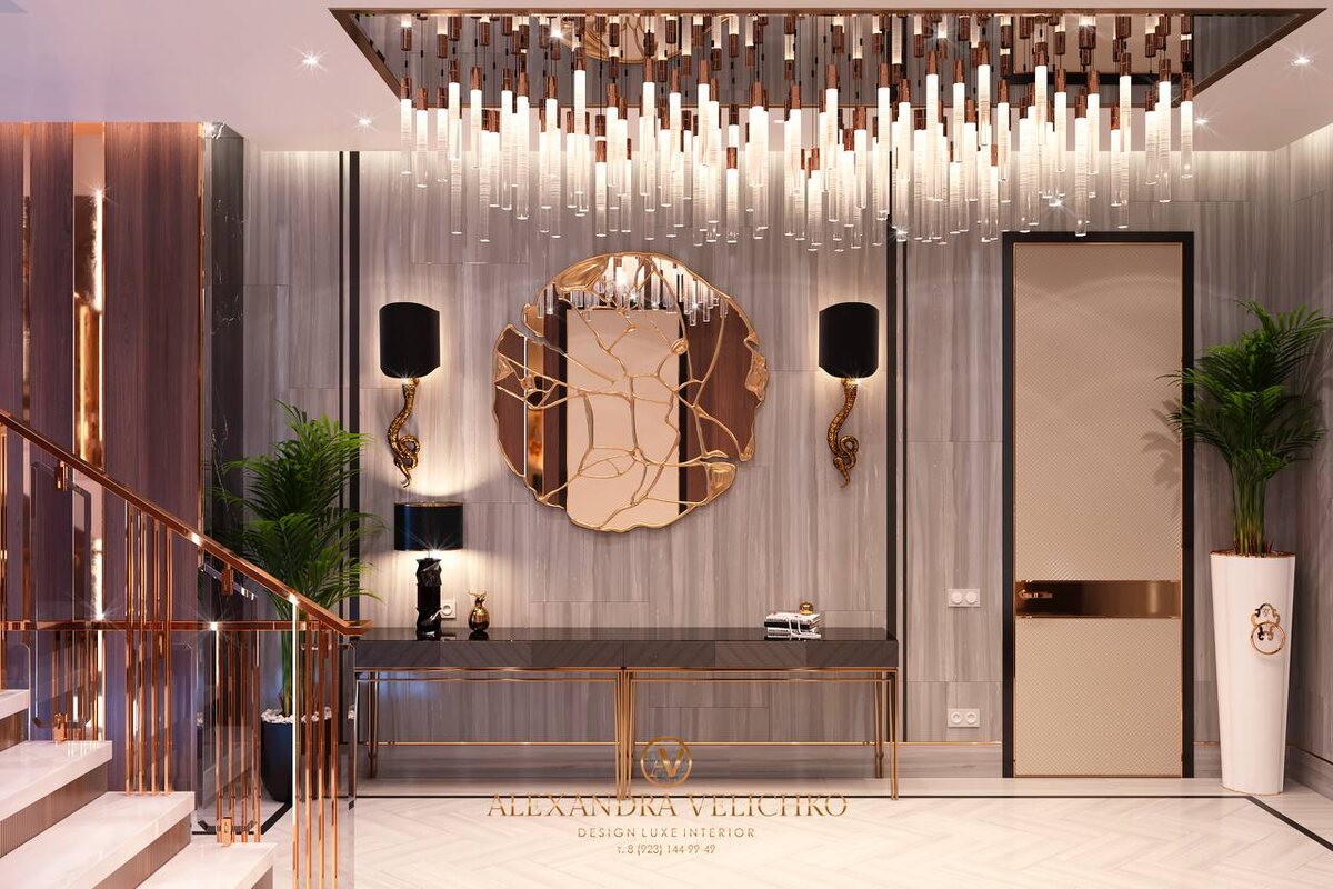Дизайн холла выполнен в стиле арт-деко. Качественный дизайн и дорогие экологичные материалы сделали интерьер по-настоящему элитным. Помимо эстетики пропорций здесь был детально продуман функционал, поэтому эргономика помещения и всего, что в нем находится, вышла грамотной и удобной для владельцев