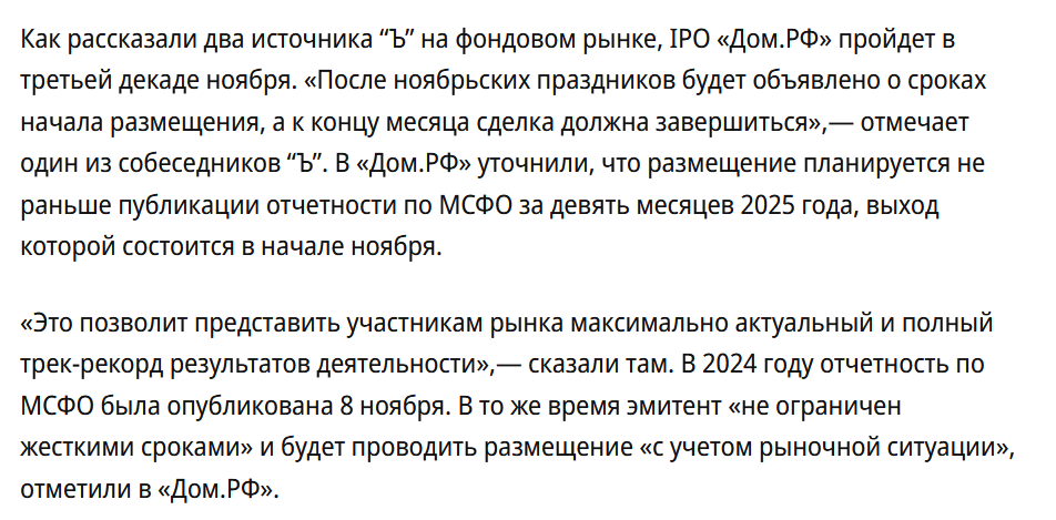 IPO "ДОМ.РФ" уже назначили на вторую половину ноября 2025 года: На рынке поговаривают, что размещение будут проводить по 0.7-0.8 от уровня капитала: И даже при таких невысоких значениях, а по-моему продавать банк ниже капитала глупо, подчеркивают, что без "якорных инвесторов" в этом случае не обойтись. Что касается акций, то "ДОМ.РФ" только сейчас выводит их на рынок, но вот в части других ценных бумаг он не новичок. На "Московской бирже" представлена серия облигаций, как самого "ДОМ.РФ", так и жилищные облигации с ипотечным покрытием, выпущенные дочерней компанией Общество с ограниченной ответственностью «Ипотечный агент «Фабрика ИЦБ». Выступая на секции "Фондовый рынок на пути к росту: IPO госкомпаний и привлечение иностранных инвесторов" ПМЭФ-2025, генеральный директор ДОМ.РФ Виталий Мутко даже похвастался, что по объему долговых ценных бумаг они с 2 трлн руб третий эмитент на рынке с 200 инстуциональными и 20 тыс розничными инвесторами. Меня эти цифры впечатлили и я решил проверит