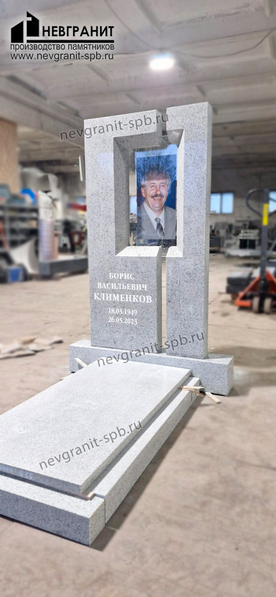 На представленной фотографии — памятник, изготовленный компанией "Невгранит" (www.nevgranit-spb.ru), посвященный Борису Васильевичу Клименкову. Он отличается лаконичным дизайном и современным подходом к мемориальному искусству.
