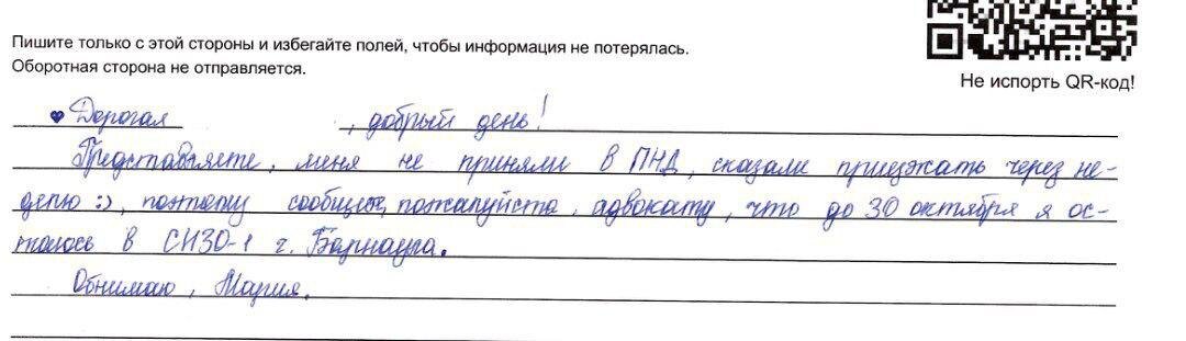 Марию Пономаренко, пытавшуюся покончить с собой в заключении, не приняли в ПНД Журналистку RusNews Марию Пономаренко, находящуюся в заключении, не приняли в психоневрологический диспансер (ПНД) на обследование, сообщила её группа поддержки в телеграме. «Представляете, меня не приняли в ПНД, сказали приезжать через неделю. Поэтому сообщите пожалуйста адвокату, что до 30 октября я остаюсь в СИЗО-1 Барнаула», — сказано в письме от Марии. 📌 В феврале 2023 года мать двоих детей Марию Пономаренко признали виновной по делу о «фейках» о ВС РФ «по мотивам политической ненависти» (пункт «д» части 2 статьи 207.3 УК) из-за поста в телеграме о гибели людей в драмтеатре в Мариуполе. Судья Ленинского райсуда Барнаула Ирина Завьялова приговорила её к 6 годам колонии. Позже её обвинили в нападении на сотрудников ИК-6 и дали ещё год и 10 месяцев. 📌 Мария Пономаренко заявляла о невыносимых условиях содержания в ИК-9 Рубцовска, где её помещали в карцер, и ИК-6 Шипуново, она жаловалась на издевате