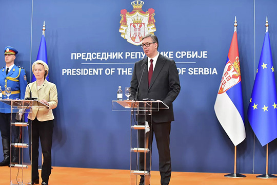 Новый импульс давлению Запада на Белград придал официальный визит главы Еврокомиссии Урсулы фон дер Ляйен 15-16 октября в Сербию, которая потребовала от Александара Вучича присоединения к санкциям ЕС в отношении России. Как заявила фонд дер Ляйен на пресс-конференции по окончании визита, «Брюссель не сможет считать Белград надежным партнером, что фактически исключает возможность приема страны в европейское сообщество».