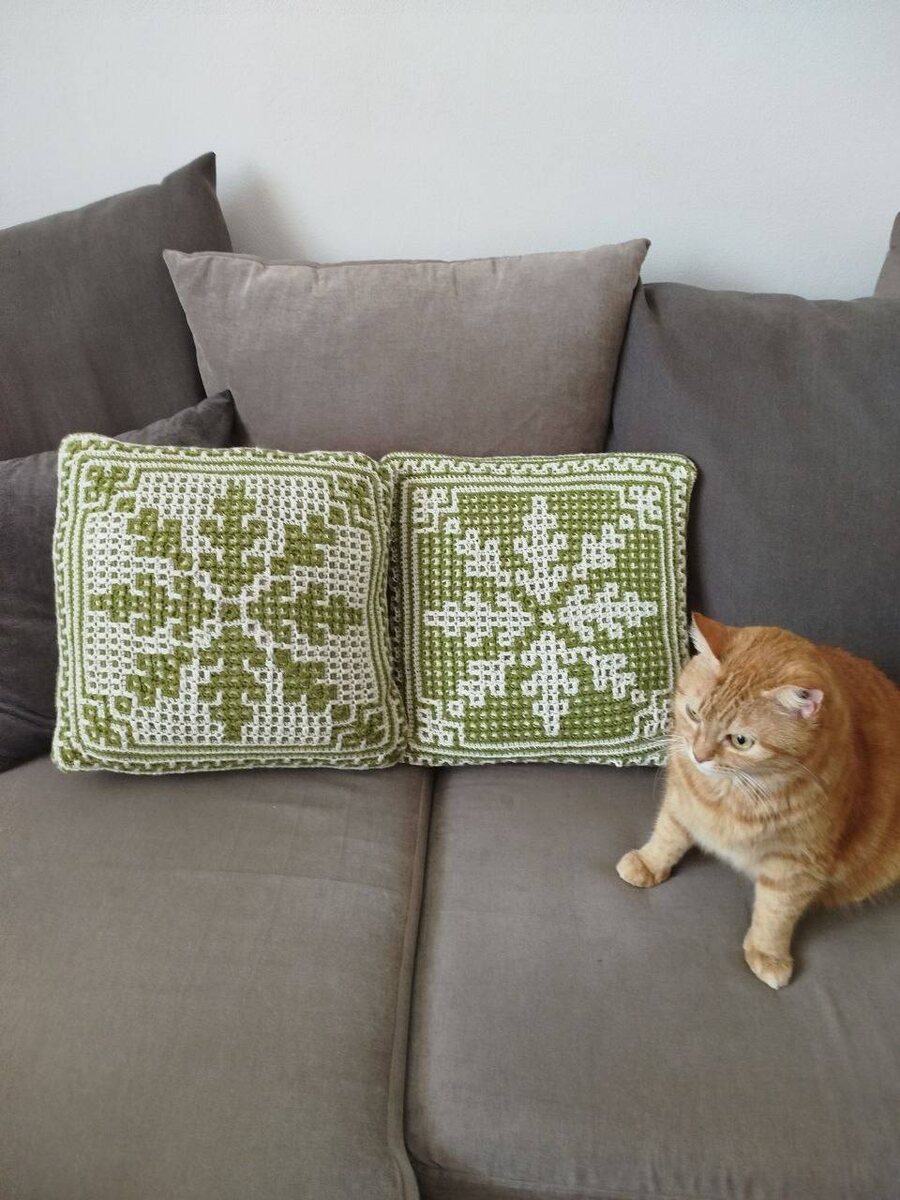 Татьяна из чата «10 нескучных подушек» связалв чудесную пару — кот, кажется, доволен)