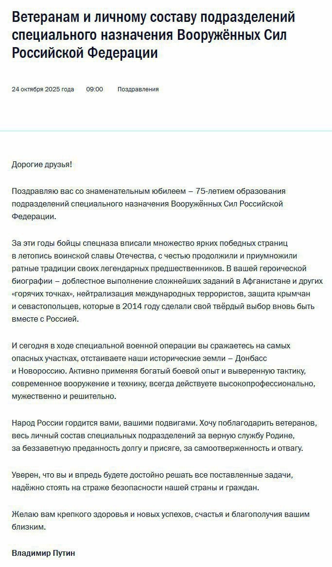 🤜"РАБОТАЙТЕ, БРАТЬЯ! " ❗️Президент России В. В. Путин поздравил спецназ ВС России с 75-летием образования Президент подчеркнул, что бойцы в ходе СВО сражаются на самых опасных участках и отстаивают исторические земли РФ, всегда действуя профессионально, мужественно и решительно. — Народ России гордится вами, вашими подвигами. Хочу поблагодарить ветеранов, весь личный состав специальных подразделений за верную службу Родине, за беззаветную преданность долгу и присяге, за самоотверженность и отвагу, — отметил глава государства. https://ok.ru/group/70000041523919 https://vk.com/public212083585 https://dzen.ru/id/660af8bc3bd95d5b99e56429 Подпишись на СВОй "Рассвет"!