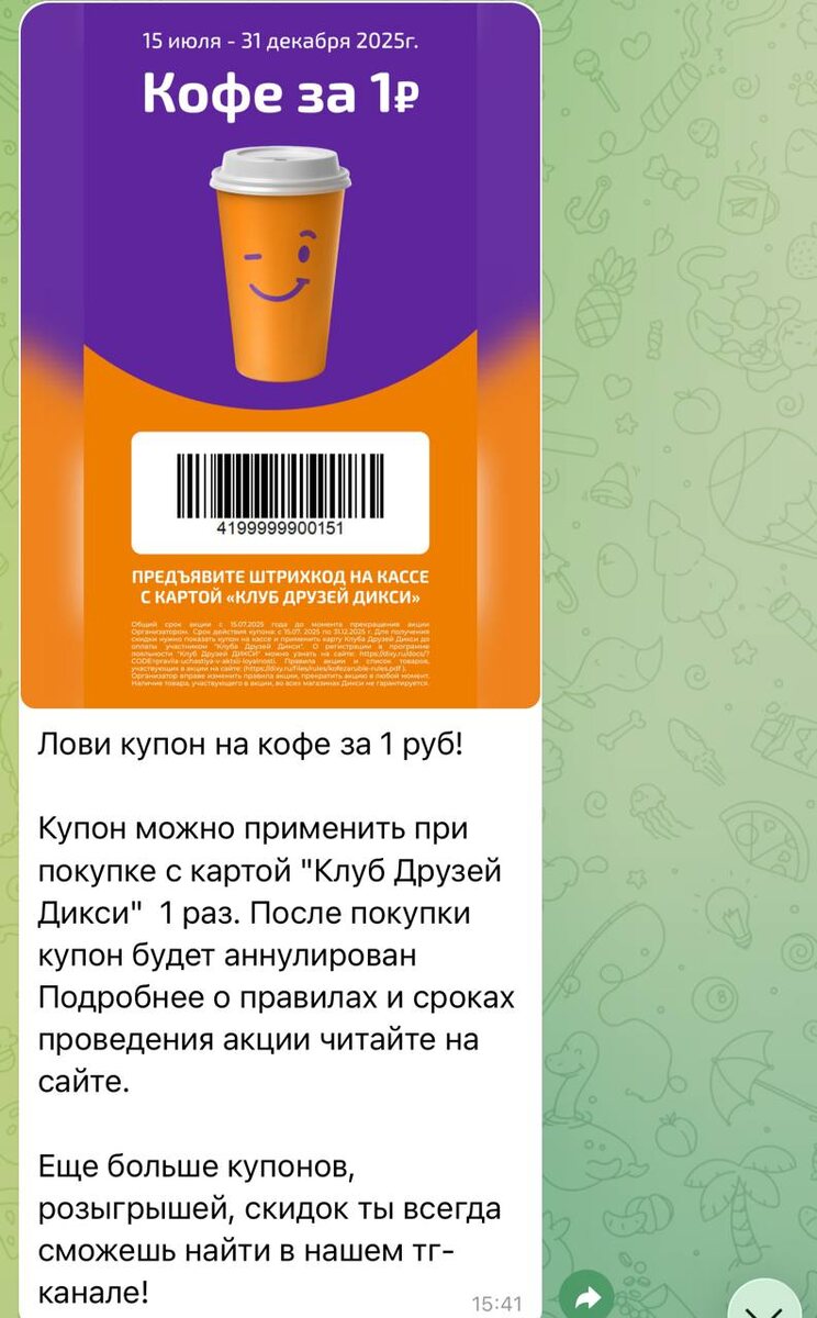 Купон на кофе за 1️⃣💵 в Дикси