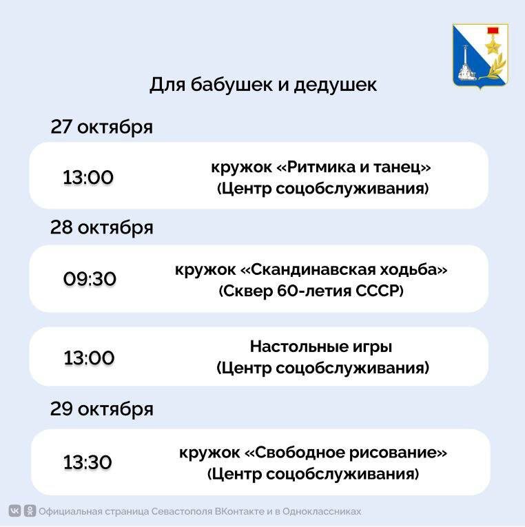 Заботимся о старшем поколении Специалисты Севастопольского центра социального обслуживания подготовили бесплатные мероприятия на следующую неделю. В карточках — расписание 🍂Не забудьте предложить своим бабушкам и дедушкам присоединиться к занятиям! Подписывайтесь на наш канал в MAX