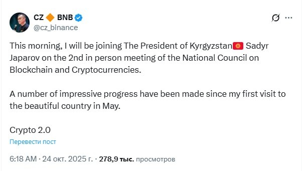 Сегодня утром я приму участие во второй личной встрече с президентом Киргизии Садыром Жапаровым в рамках Национального совета по блокчейну и криптовалютам. С момента моего первого визита в эту прекрасную страну в мае был достигнут значительный прогресс. Crypto 2.0