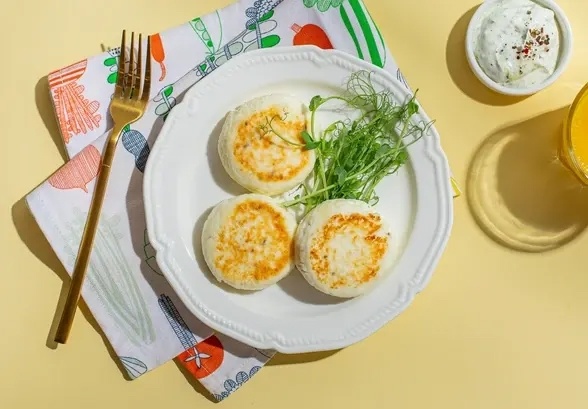 35 мин 3 порции Ингредиенты: - творог 9% - 400 г - яйцо СО - 1 шт. - пармезан тёртый - 30 г - соль - 2 г - базилик сухой - ⅓ ч. л. - орегано - ⅓ ч. л. - мука рисовая - 30 г + 40 г - масло растительное - 50 мл Для соуса: - сметана 20% - 150 г - соус песто - 15 г Приготовление: 1. Смешайте творог с яйцом и солью, затем добавьте базилик, орегано, сыр и 30 г рисовой муки. 2. Замесите тесто и разделите его на шарики примерно по 70 г. 3. Сформируйте из шариков сырники, обваляйте в оставшейся рисовой муке. 4. Обжарьте сырники на растительном масле до золотистой корочки с обеих сторон. Затем выложите на противень и уберите в духовку, разогретую до 170 °C, на 7 минут. 5. Сметану перемешайте с песто до однородности и подавайте сырники с получившимся соусом.