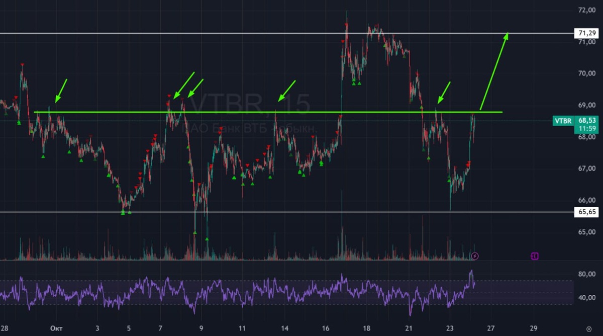 🏦 ВТБ! 🟢 ВТБ приблизился к локальному уровню сопротивления, в который до этого бились несколько раз. Конечно же я жду пробой этой линии и снова поход на 71,39. Вышел хороший отчет. 🏠 Чистая прибыль ВТБ по МСФО за 9 месяцев выросла на 1,5% и составила 380,8 млрд рублей. 🏠 Банк сохраняет планы получить чистую прибыль в 500 млрд рублей в 2025 году. 🏠 ВТБ ожидает прибыль от второго выделения заблокированных активов и пассивов в размере «нескольких десятков» миллиардов рублей. 🏠 Также ВТБ планирует продать отель Courtyard by Marriott Kazan Kremlin в Казани. #ВТБ #VTBR #bogdanoffinvest