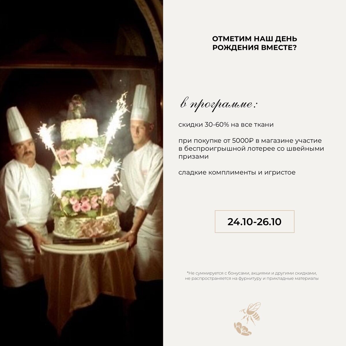 Приглашаем вас отметить такое важное событие вместе с нами💛 В эти выходные мы отмечаем день рождения O‘fabric, а это значит, что вечеринке быть! Только 24.10-26.10 в нашем магазине будут скидки 30-60% на все ткани и беспроигрышная лотерея со швейными призами Скидка -30% распространяется на ВСЕ ткани!!! Ровно три дня! Ткани -50% и-60% отмечены специальными стикерами в магазине ❤️ Скидки не распространяются на фурнитуру и прикладные материалы, подкладочные, не суммируются с бонусами и другими скидками клиента❤️ Ну и конечно, какой праздник без сладкого и игристого?🥂 Без вас — не было бы нас! Ждем в гости на Фурштатской, 32! Обращаем ваше внимание, что во время распродажи ткани не бронируем! Благодарим за понимание ❤️