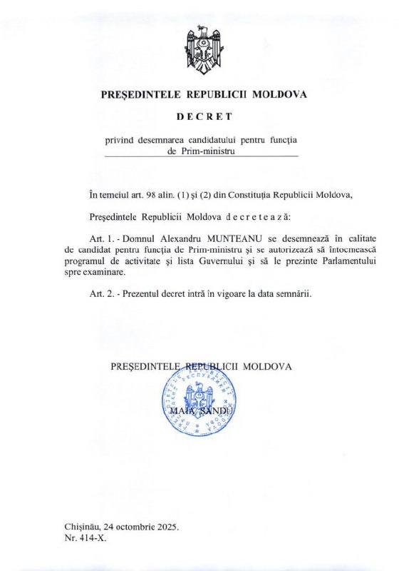 Санду подписала указ о выдвижении Мунтяну кандидатом на должность премьер-министра РМ.