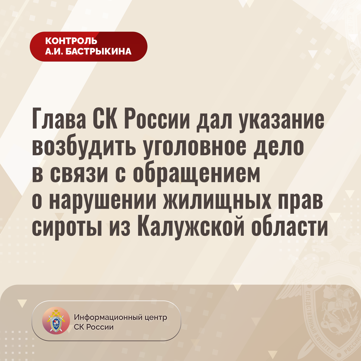 Глава СК России дал указание возбудить уголовное дело в связи с обращением о нарушении жилищных прав сироты из Калужской области
