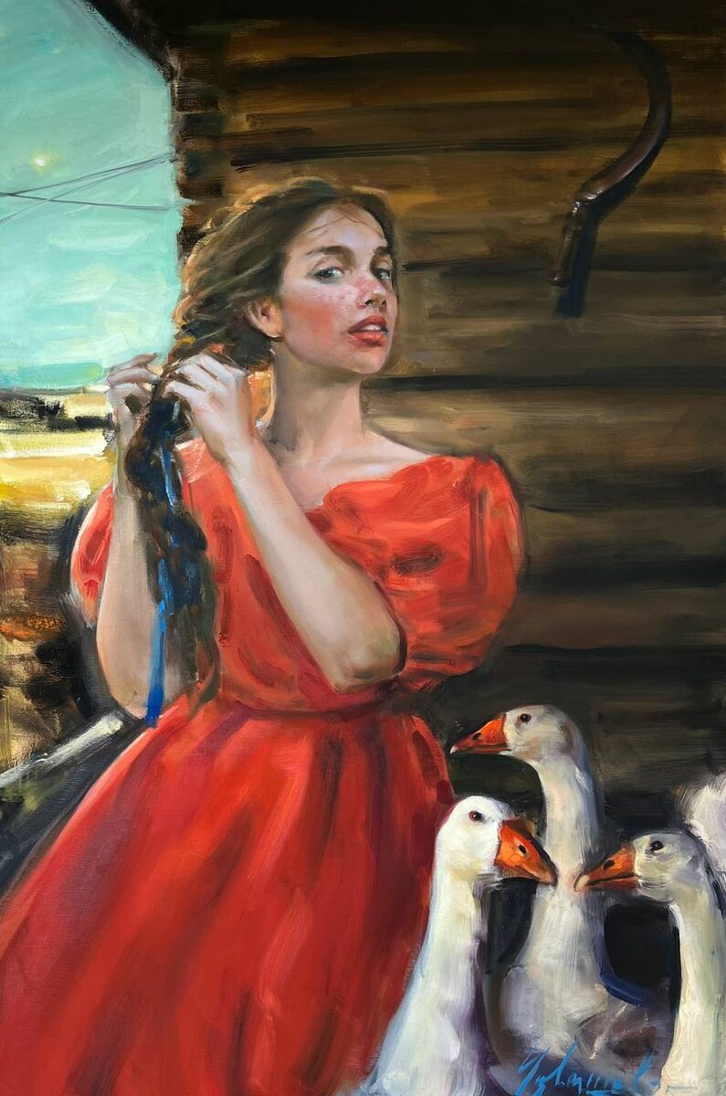 В картине «Гуси-гуси» Александр Чувашев соединяет чувственность и простоту: девушка в ярком платье заплетает косу, глядя на зрителя с лёгким