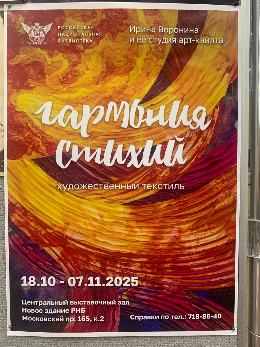 С 18 октября 2025 года в Выставочном зале Российской Национальной библиотеки (РНБ) Новое здание на Московском проспекте-165 открылась выставка «Гармония стихий: художественный текстиль. Выставка Ирины Ворониной и студии Арт-квилта».