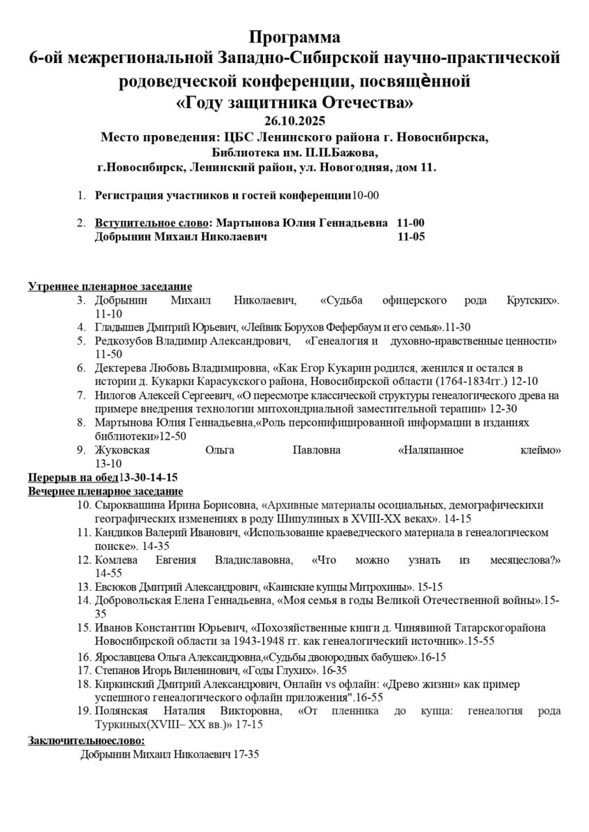 В это воскресенье буду рассказывать на Западно-Сибирской научно-практической родоведческой конференции, как одна из ветвей балашовский Туркиных оказалась в Сибири. Программа очень интересная и насыщенная, планирую посмотреть, кого успею. моё выступление в 13:15 по саратовскому времени. Ссылка на трансляцию: https://telemost.yandex.ru/j/24752122573977