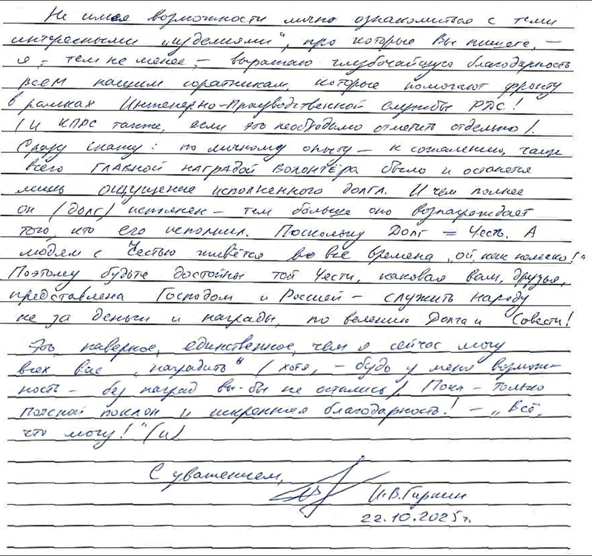 Не имея возможности лично ознакомиться с теми интересными “изделиями”, про которые Вы пишете, - я, - тем не менее, - выражаю глубочайшую благодарность всем нашим соратникам, которые помогают фронту в рамках Инженерно-производственной службы РДС! (И КРПС также, если это необходимо отметить отдельно). Сразу скажу: по личному опыту – к сожалению, чаще всего главной наградой волонтёра было и останется лишь ощущение исполненного долга. И чем полнее он (долг) исполнено – тем больше оно вознаграждает того, кто его исполнил. Поскольку Долг = Честь. А людям с Честью живётся во все времена “ой, как нелегко!” Поэтому будьте достойны той Чести, каковая вам, друзья, представлена Господом и Россией – служить народу не за деньги и награды, по велению Долга и Совести! Это, наверное, единственное, чем я сейчас могу всех вас “наградить” (хотя, - будь у меня возможность – без наград вы – бы не остались). Пока – только поясной поклон и искренняя благодарность! - “Всё, что могу” (ц). С уважением, И.В. Гирк