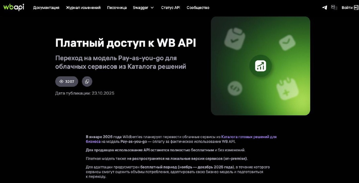 WB вводит платный доступ к API: новая эпоха для сервисов аналитики На портале разработчиков Wildberries появилась ключевая новость: с января 2026 года доступ к WB API для облачных сервисов из каталога решений переходит на платную модель Pay-as-you-go — оплату за фактическое использование. Что это значит • Продавцы продолжают работать бесплатно, как и раньше. • А вот внешние аналитические и интеграционные сервисы (SaaS) теперь будут платить WB за каждое обращение к API. • Бесплатным останется ограниченный набор базовых методов (19+ штук) — справочники, предметы, цвета, акции и т. п. • Всё остальное — отчёты, карточки, цены, остатки, заказы — становится платным по системе «пакетов сущностей». Почему это важно Wildberries официально переходит от “открытого” API к контролируемой модели доступа к данным. И именно с этим, скорее всего, связаны последние события — включая закрытие данных для сторонних аналитических сервисов и сокращение окна доступности отчётов до 48 часов. Фактически W