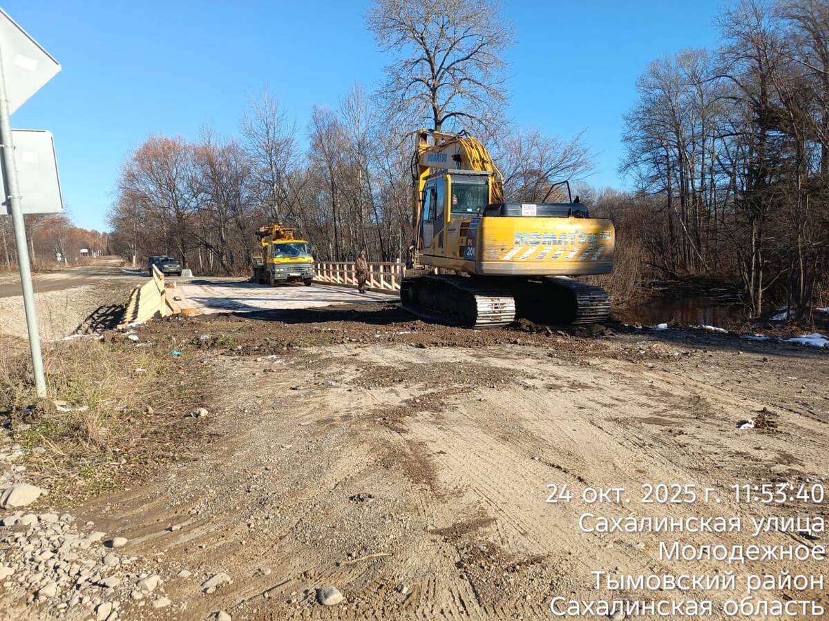 🚘В селе Молодёжном открыли движение по отремонтированному мосту ⚙️Подрядная организация АО «Тымовское ДРСУ» завершила капитальный ремонт моста на въезде в село Молодёжное Тымовского района, а также сделала подъездные пути к нему. Движение на участке автодороги открыто с 24 октября. В середине апреля искусственное сооружение в Молодежном было разрушено в результате подтопления автодороги из-за значительного подъема воды в реках Тымь и Славка. Весной на участке оперативно были выполнены восстановительные работы, уложена временная дренажная труба. Далее совместно с районной администрацией мы организовали капитальный ремонт моста. Сегодня работы были приняты, мост введен в эксплуатацию, — рассказал первый замминистра транспорта и дорожного хозяйства Эдуард Ри. ✅Мы в Telegram | MAX