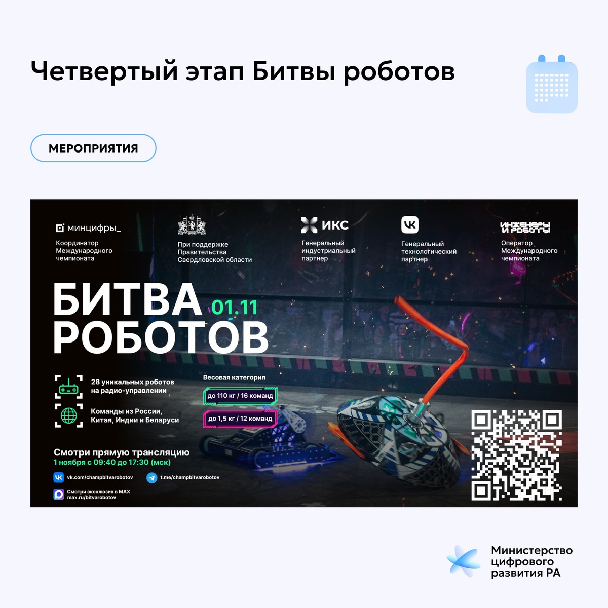 🤖Четвертый этап «Битвы роботов» 🗓Мероприятие пройдет 1 ноября 2025 г. с 11:30 до 19:30 (по местному времени) при поддержке Правительства Свердловской области. 📍Территория проведения — Международный выставочный центр «Екатеринбург-ЭКСПО» по адресу: Свердловская область, г. Екатеринбург, ЭКСПО-бульвар, д. 2. Программой мероприятия предусмотрено два шоу: дневное (с 13:00 до 14:30) и вечернее (с 18:00 до 19:30). 🔹На арене встретятся 28 команд из России, Беларуси, Индии и Китая. В программе — поединки мощных машин в категориях до 110 кг и до 1,5 кг. Состав участников: ➖16 команд (взрослые) — роботы до 110 кг; ➖12 команд (дети) — мини-роботы до 1,5 кг. 🔹За предыдущие три отборочных этапа Чемпионата, в которых приняли участие 84 команды со всего мира, только 24 встретятся в финальном этапе, чтобы побороться за титул чемпиона битвы роботов 2025 года. ➡️Подробнее о «Битве роботов» на сайте https://www.gosuslugi.ru/landing/bitvarobotov ➡️Ссылка на прямую трансляцию Чемпионата https:/