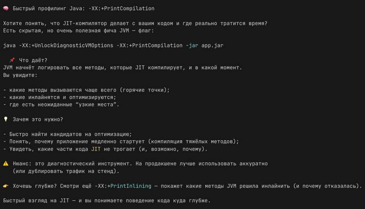 🧠 Быстрый профилинг Java: -XX:+PrintCompilation Хотите понять, что JIT-компилятор делает с вашим кодом и где реально тратится время? Есть скрытая, но очень полезная фича JVM — флаг: java -XX:+UnlockDiagnosticVMOptions -XX:+PrintCompilation -jar app.jar 📌 Что даёт? JVM начнёт логировать все методы, которые JIT компилирует, и в какой момент. Вы увидите: - какие методы вызываются чаще всего (горячие точки); - какие инлайнятся и оптимизируются; - где есть неожиданные “узкие места”. 💡 Зачем это нужно? - Быстро найти кандидатов на оптимизацию; - Понять, почему приложение медленно стартует (компиляция тяжёлых методов); - Увидеть, какие части кода JIT не трогает (и, возможно, почему). ⚠️ Нюанс: это диагностический инструмент. На продакшене лучше использовать аккуратно (или дублировать трафик на стенд). 👉 Хочешь глубже? Смотри ещё -XX:+PrintInlining — покажет какие методы JVM решила инлайнить (и почему отказалась). Быстрый взгляд на JIT — и вы понимаете поведение кода куда глубже.