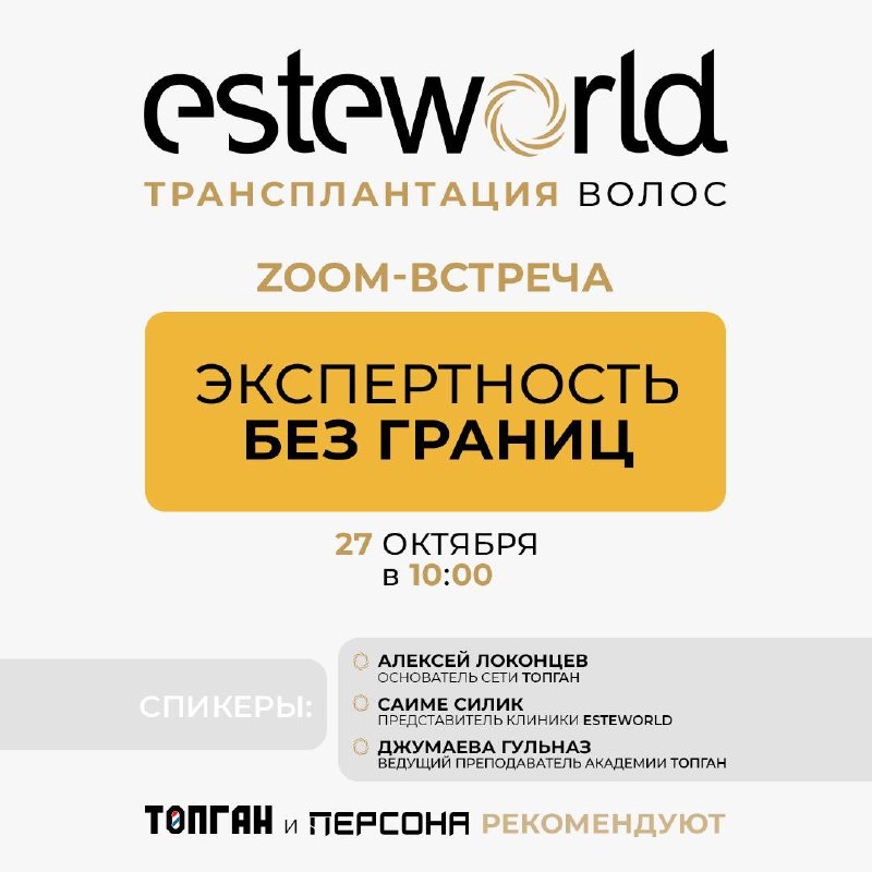 Всем привет! С радостью сообщаю, что «ТОПГАН» и «Персона» начали сотрудничество с клиникой «Esteworld» в России! 🚀 Это не просто партнерство — оно открывает новые возможности по дополнительному заработку для всех барберов и бьюти-мастеров страны с одной из лучших клиник Турции! Для всех желающих предусмотрены специальные условия, которые выгодны как клиентам, так и мастерам. Приглашаю вас на Zoom-встречу , где я и приглашенные спикеры подробно расскажем о сотрудничестве и поделимся личным опытом: 🗓 27 октября в 10:00 Ссылка на встречу будет опубликована в этом канале за 10 минут до начала