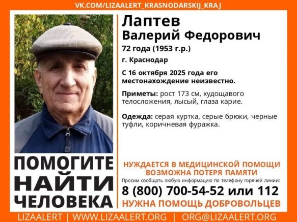 В Краснодаре уже несколько дней разыскивают 72-летнего Валерия Федоровича Лаптева. Он ушел из дома 16 октября и до сих пор не вернулся. Последний раз Валерий Лаптев попадал на камеры видеонаблюдения 19 октября. Ранним утром (в период с 05:30 до 07:00) его видели на территории рынка “Гарант” (пересечение Уральской и Лизы Чайкиной). Он шел босиком, без верхней одежды и шапки. Приметы Валерия Лаптева: рост 173 см, худощавое телосложение, лысый, карие глаза. Из дома вышел в серой куртке и серых брюках, черных туфлях и коричневой фуражке. Всех, кому что-либо известно о местонахождении Валерия Лаптева, просят позвонить по многоканальному телефону поискового отряда “ЛизаАлерт” 8 800 700 5452 либо по телефону инфоорга Наталии 8 928 2056256.