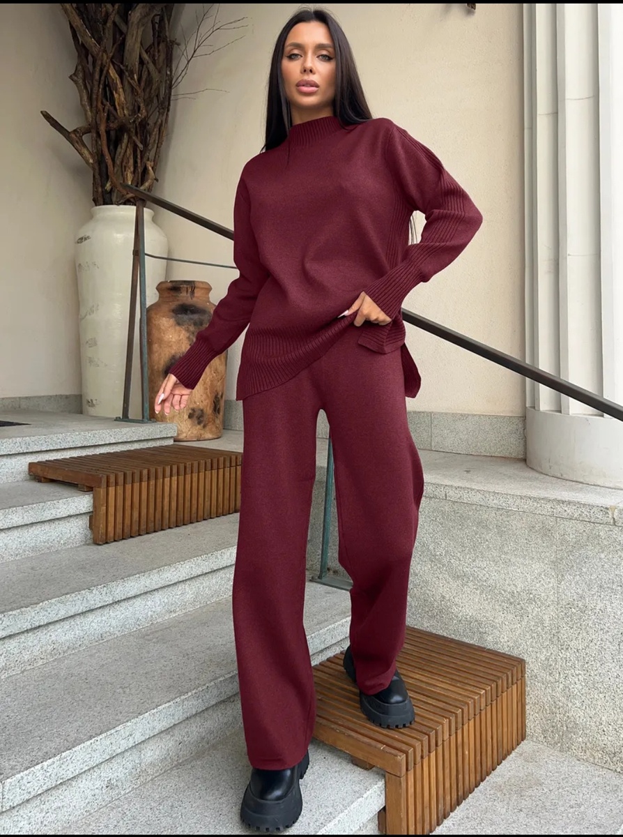 Свободный крой оверсайз — то, что нужно для прохладной погоды, когда хочется надеть под низ что-то объёмное. Брюки-клеш визуально вытягивают силуэт, что особенно актуально для невысоких девушек. При этом костюм отлично сидит на фигурах plus size, мягко облегая, но не обтягивая. Длинные рукава свитера прикрывают запястья, добавляя тепла.