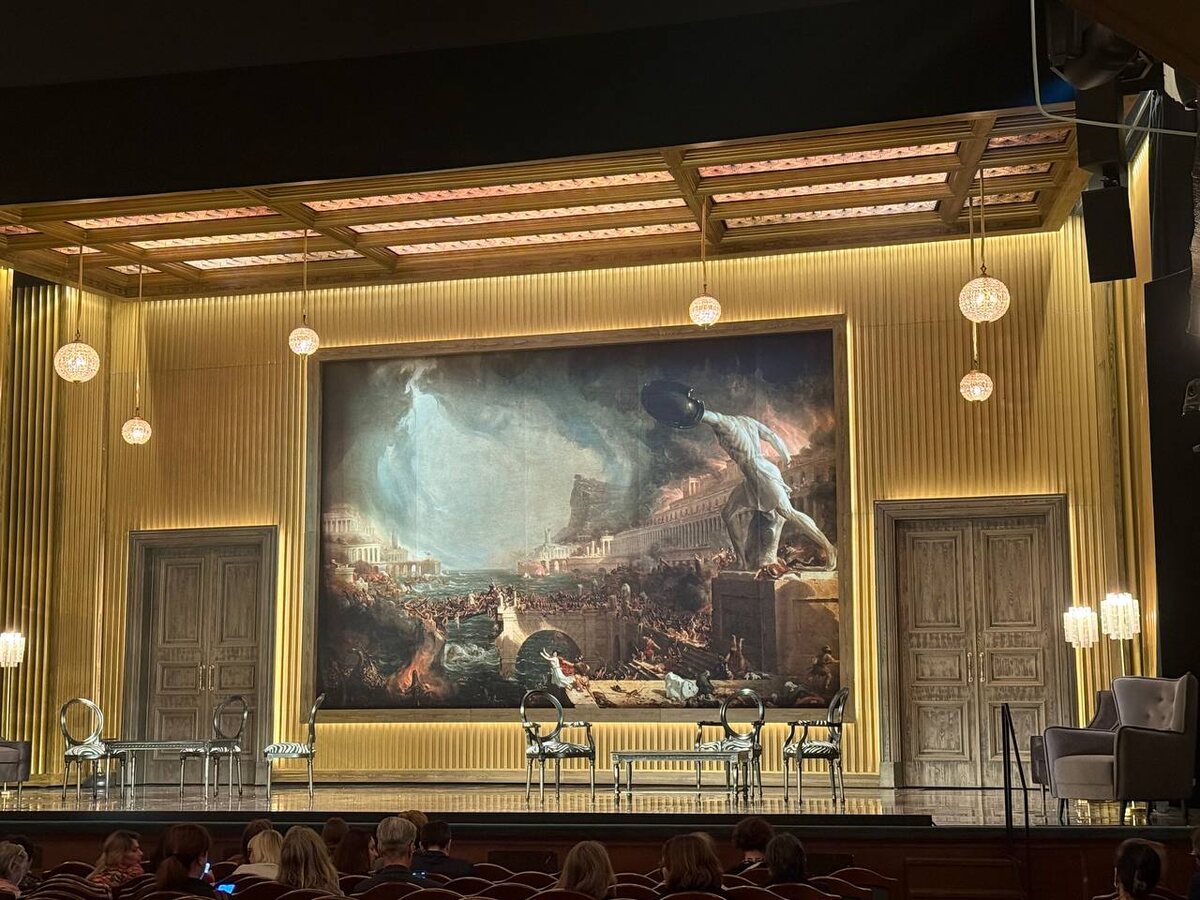 "Игра интересов" РАМТ Режиссер Алексей Бородин 2 часа 15 минут без антракта Занавес поднят изначально. Заходишь в зал - и любуешься оформлением сцены, художник Максим Обрезков, тут сразу понятно, что будет красиво. И да, это спектакль завораживающей красоты! Сценография, костюмы и свет - высший пилотаж! Огромная картина «Крушение империи» дает некоторую подсказку, но сперва на сцену выбегут, запыхаясь, два жулика, которые начнут разыгрывать испанский фарс. Гротеск, блеск,шутки. Ты только втянешься - и картина исчезает, открывая второе поле для игры. Английская драма, первая мировая война, окопы, боль, потери. Этот тумблер будет щелкать раз за разом. Фарс - боль. Фарс - боль. Две истории разворачиваются параллельно, и как же сложно мне было… Да, мне было трудно переключаться из одного режима в другой. «Военная» часть прорастала в меня сразу и глубоко, «мирная» рывком выдергивала из состояния сопереживания и казалась чужеродной. Но этот контраст - авторская режиссерская задумка, котора