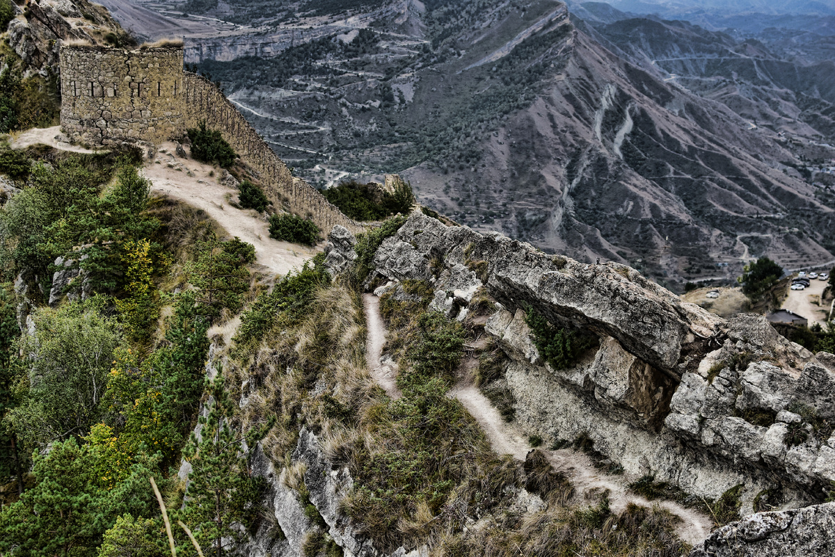 Семейная пара поднимается наверх крепости по узкой горной тропе.