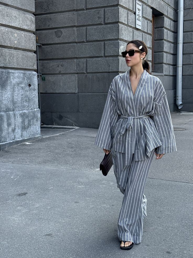 - Льняной или хлопковый костюм с широкими рукавами и брюками — комфорт и минимализм для делового и дневного образа.