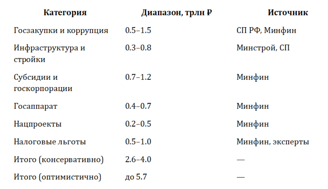По экспертным оценкам, переплаты по госзакупкам составляют 10–30% от их общего объема (около 10 трлн рублей ежегодно). Счетная палата выявила нарушения в госзакупках на 11,8 млрд ру