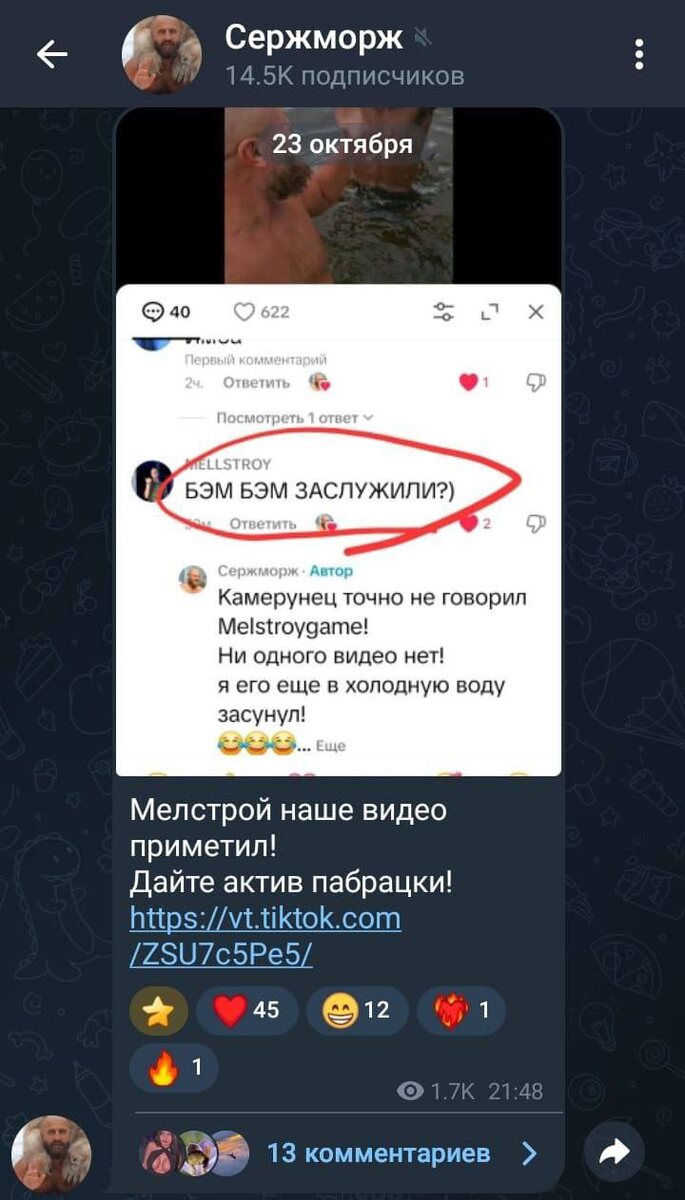 «Здравствуйте, Алёна. Вчера на канале Сержморж (Сергей Трифонов) увидел пост на его канале, на который он дал ссылку на свой Тик-ток, где ссылка на сайт онлайн-казино Меллстроя.