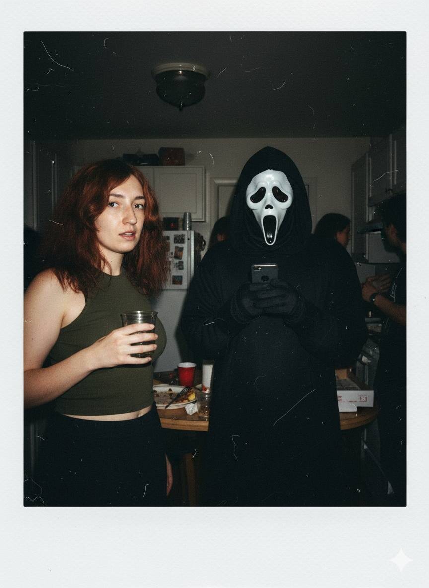 Put this girl standing next to Ghostface in a dim apartment kitchen, she's holding a drink, he's distracted by his phone, Polaroid flash, visible film dust, soft blur, moody 2000s vibe, looks like an accidental photo at a tired afterparty
