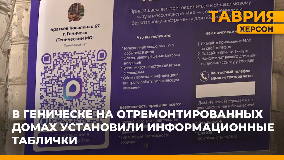 В Геническе на домах после капитального ремонта появились информационные таблички. Это часть пилотного проекта, который призван улучшить связь между жителями и управляющими компаниями. На табличках размещён QR-код, ведущий в общедомовой чат. Через него жильцы могут сообщать о неисправностях и поломках, а также оставлять отзывы о выполненных работах. «Общедомовые чаты — это еще один дополнительный канал информации для управляющей компании о том, что происходит в доме, как проводит работу управляющая компания, с чем справляется, с чем не справляется», — рассказал главный инженер единого регионального фонда по управлению МКД Алексей Анищенков. Сотрудники ведомства добавили, что капитальный ремонт многоквартирных домов продолжится. До конца 2028 года кровельное покрытие обновят в 60 домах Геническа, а также разработают план текущих работ. Ранее ТРК «Таврия» сообщала, что в Херсонской области подвели итоги выполнения национальных проектов по состоянию на сентябрь.