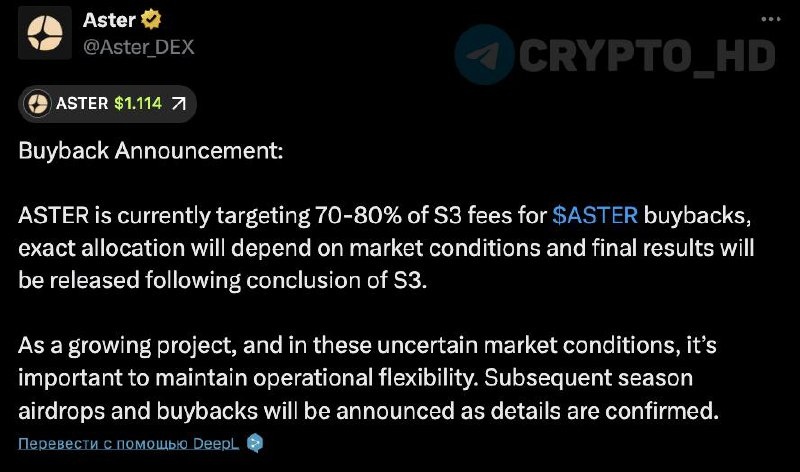 🥳 В Aster планируют направить 70-80% комиссий сезона S3 на обратный выкуп токенов #ASTER с открытого рынка. Ранее: - партерство с Trust Wallet - MrBeast покупает ASTER Crypto Headlines