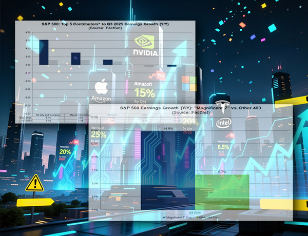 Темпы роста прибыли компаний, входящих в «Великолепную семёрку», ускорится с нынешних 15% до 20% в третьем квартале 2026 года. Совокупный темп роста прибыли компаний, входящих в индекс S&P500 в 3-м квартале 2025 года составил 8,5%. Пятью компаниями, которые внесли наибольший вклад в рост прибыли S&P500 в годовом исчислении в 3-м квартале (в порядке убывания), являются Nvidia, Boeing, Eli Lilly, Intel и Micron Technology. Таким образом, только одна из пяти компаний, внесших наибольший вклад в рост прибыли индекса в третьем квартале по сравнению с прошлым годом, входит в «Великолепную семёрку». Между тем, высокие темпы Boeing и Intel связаны с эффектом низкой базы – год назад эти компании показали убытки. Ожидается, что в совокупности «Великолепная семёрка» компаний продемонстрирует рост прибыли в годовом исчислении на 14,9% в 3-м квартале. Без учёта этих семи компаний совокупный темп роста прибыли оставшихся 493 компаний из индекса S&P500 в 3-м квартале 2025 года составит 6,7%. Напомним