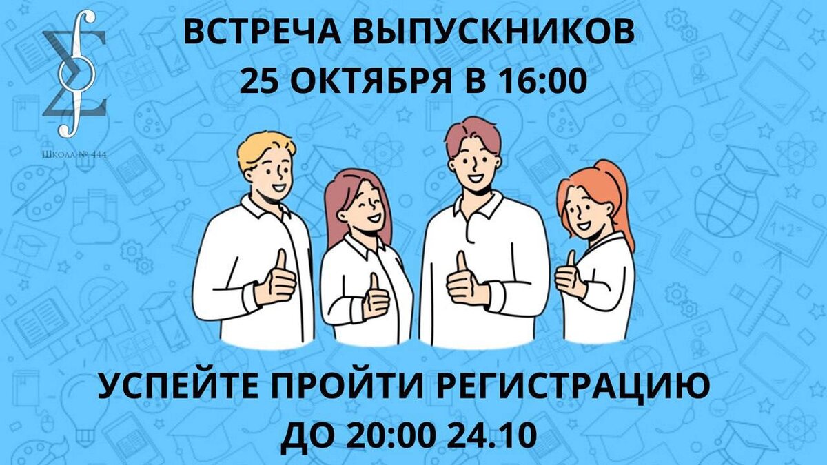 🎉Встреча выпускников — 2025🎉 📅 Дорогие друзья и учителя! Уже совсем скоро состоится долгожданная встреча Школы № 444! 🏫 Приглашаем одноклассников, выпускников, педагогов и сотрудников, которые работали и работают в стенах школы №444, чтобы с теплом вспомнить школьные годы и прекрасно провести вечер в душевной компании. 📍 Мероприятие пройдет 25 октября в 16:00 по адресу Нижняя Первомайская ул., д. 14. 🔔 Важно! Регистрация обязательна и заканчивается уже сегодня! ❗️ Пожалуйста, пройдите регистрацию до 20:00 24.10.2025: 👉 Для выпускников; 👉 Для сотрудников. 🥨 Дорогие друзья! Приглашаем юбилейные выпуски этого и прошлого года получить традиционные сувениры во второй кабинет на первом этаже по графику. Первыми ждем выпуски в 17:00: — 1955, 1959, 1960, 1964, 1965, 1969, 1970, 1974, 1975, 1979, 1980, 1984, 1985. Второй поток в 17:30: — 1989, 1990, 1994, 1995, 1999, 2000, 2004, 2005. Третий поток в 18:00: — 2009, 2010, 2014, 2015, 2019, 2020, 2024, 2025. ✨ Программа мероприятия