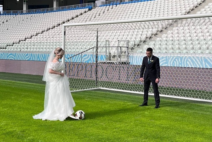 Первая пара волгоградцев зарегистрировала брак на стадионе «Волгограда Арена». О необычном для спортивного сооружения мероприятии сообщили в Telegram-канале арены. Судя по кадрам, которые были опубликованы пресс-службой стадиона, регистрация брака прошла на одной из трибун, а на табло светились имена молодоженов со счетом 1:0 в пользу жениха. Фотосессию волгоградцы устроили в том числе и на поле «Волгоград Арены». Фото: @vlgstadium