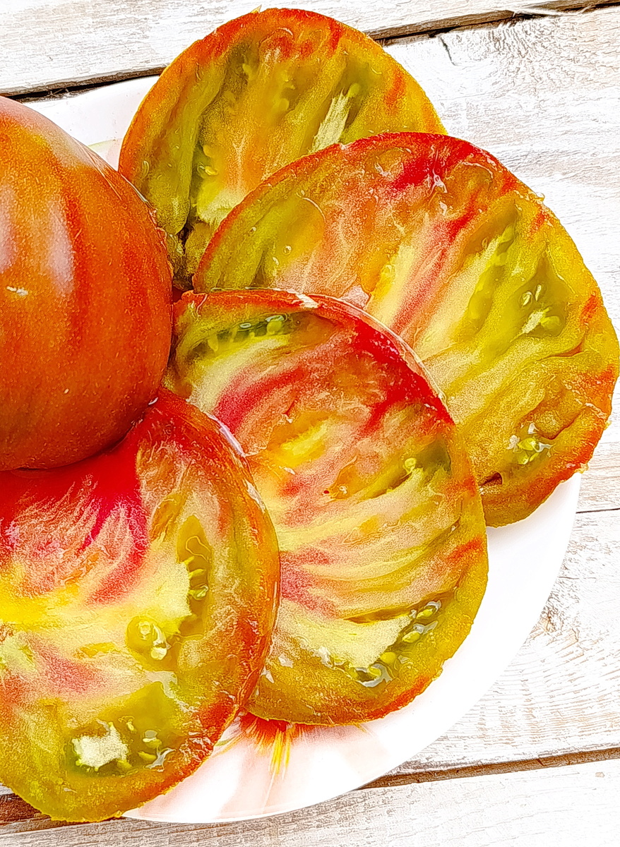 Добрый день, мои уважаемые собеседники и гости канала. Продолжаю рассказывать вам о новинках томатов этого сезона. Обратите внимание, что в галерее прикреплено по нескольку фотографий, листайте. Сорт для наслаждения Индетерминантный, среднеспелый, высокорослый и крепкий куст. Плоды коричневато желтовато ржавого цвета, огромные красавчики триколоры до 750 грамм. Очень вкусный - для меня все триколоры очень вожделенны и вкусны! Плоды вызревшие в жаркий солнечный период, конечно же были значительно вкуснее, чем осенние. Ох, как же я люблю добавлять такие сорта в салаты. Они сразу начинают играть всеми красками радуги. Индетерминантный, высокорослый , среднеспелый. Плоды в основном сердцевидные иногда встречаются тупоносые, вес 300-450гр, Обычно я все кусты веду минимум в 3 ствола, при ведении в 2 ствола, плоды получаются крупнее. Мякоть очень приятная, нежная, вкусная, семян в плодах мало. Желтых плечиков нет, это фото на ярком солнце. Индетерминантный, среднеспелый, высокорослый. П