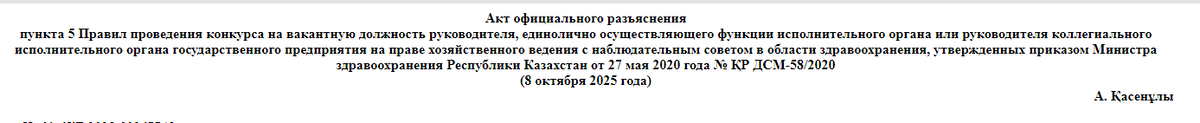 (8 октября 2025 года) А. Қасенұлы Наименование уполномоченного органа, разъясняющего норму НПА: Министерство здравоохранения (далее - МЗ); Наименование акта разъяснения с указанием структурного элемента НПА, в котором содержится разъясняемая норма, даты принятия нормативного правового акта, содержащего разъясняемую норму: пункт 5 Правил проведения конкурса на вакантную должность руководителя, осуществляющего функции исполнительного органа или руководителя коллегиального исполнительного органа ГП на ПХВ с НС в области здравоохранения (далее - Правила), утвержденных приказом МЗ РК РК от 27 сентября 2020 года № ҚР ДСМ-58/2020; Дата принятия акта 1 октября 2025 года. Наименование органа л