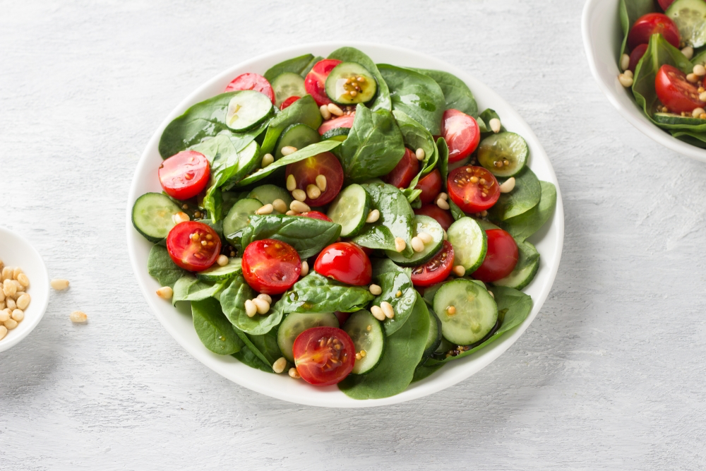 Калорийность (100g): 112 ккал Ингредиенты: Шпинат – 50 г Помидоры черри – 200 г Огурец – 120 г Орехи кедровые – 1 ст.л. Масло оливковое – 3 ст.л. Уксус бальзамический – 1 ст.л. Мед – 0.5 ч.л. Горчица – 0.5 ч.л. Соль – по вкусу Перец черный – по вкусу Приготовление: Шаг 1 Подготовить все ингредиенты для салата со шпинатом, помидорами и огурцами. Шпинат можно взять молодой с нежными листочками, так называемый бэби-шпинат, или более крупный. По вкусу они отличаются, бэби-шпинат немного сладковатый, а крупный шпинат – более терпкий, плотный, и некоторые сорта даже немного вяжут из-за большого содержания в них железа. Помидоры черри можно заменить на обычные помидоры, лучше, если они будут вкусными, мясистыми и некислыми. Огурцы лучше взять нежные с тонкой кожицей. Кедровые орехи можно заменить на фундук, миндаль или тыквенные семечки. Для заправки желательно использовать неострую горчицу кисло-сладкую, можно однородную или зерновую. Шаг 2 Все овощи хорошо промыть под проточно