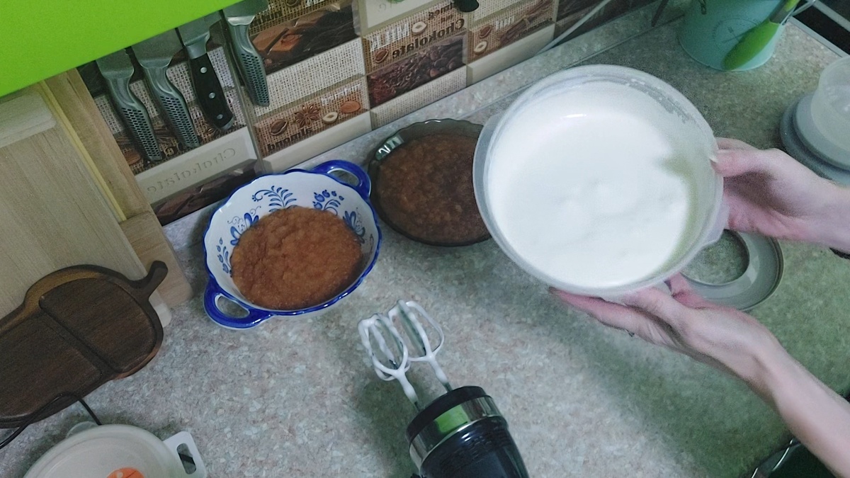 Для нежнейшего бисквита: -4 яйца; -100гр. сахара; -100гр. муки; -10гр. разрыхлителя; -3гр. ванили; -20мл. раст.масла; -щепотка соли. Для начинки: -1кг. яблок; -0.5кг. мандаринов; -150гр. сахара; -1ч.ложка кукурузного крахмала; -30мл. теплой воды. Способ приготовления. Взбиваем яйца, комнатной температуры, с сахаром и солью до белой воздушной массы. Вводим масло и продолжаем взбивать на большой скорости еще минуты 3-4. Смешиваем муку и разрыхлитель и лопаточкой аккуратно вводим в яичную смесь, чтобы она не осела. На противень стелим пергамент и распределяем по нему бисквитную смесь в пласт толщиной 1см. Выпекаем при t 170°С, режим верх-них, 10-15мин. Готовый бисквит сразу - горячим - скручиваем в рулет, накрыв полотенцем. Чтобы он в дальнейшем легко сворачивался и не ломался. Начинку готовим заранее, чтобы она остыла и загустела. Очищаем яблоки и мандарины от кожуры. Яблоки нарезаем на четвертинки и удаляем серединку, перемалываем яблоки и мандарины на мясорубке. Будет много сока -