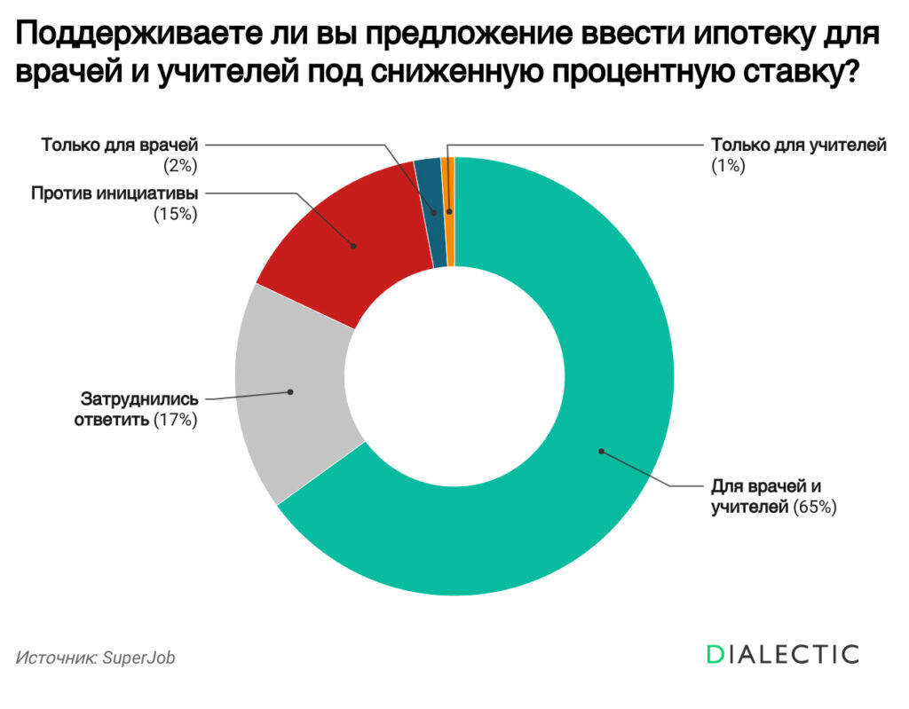 Экономически активные россияне одобрили инициативу о введении льготной ипотеки для врачей и учителей. Об этом сообщает Исследовательский центр SuperJob. Инициативу полностью поддержали 65% респондентов. За ипотеку только для врачей выступили 2% опрашиваемых, а только для учителей — 1%. Против высказались 15% респондентов, а затруднились ответить всего 17%. Среди врачей и учителей доля поддержки инициативы составила 76%, против высказались 12% врачей и 10% учителей. Интересно, что с возрастом россияне активнее поддерживают идею целевой ипотеки для социально значимых профессий. Так, люди в возрасте от 35 до 45 лет одобряют идею в 68% случаев против 65% среди людей младше 34 лет. Еще чаще инициатива получает отклик среди людей с доходами от 100 тысяч рублей: 72% опрашиваемых с таким доходом поддерживают инициативу полностью. Ранее исследование РИА Новости показало, что лишь 16,1% российских семей могут позволить себе ипотеку на рыночных условиях.