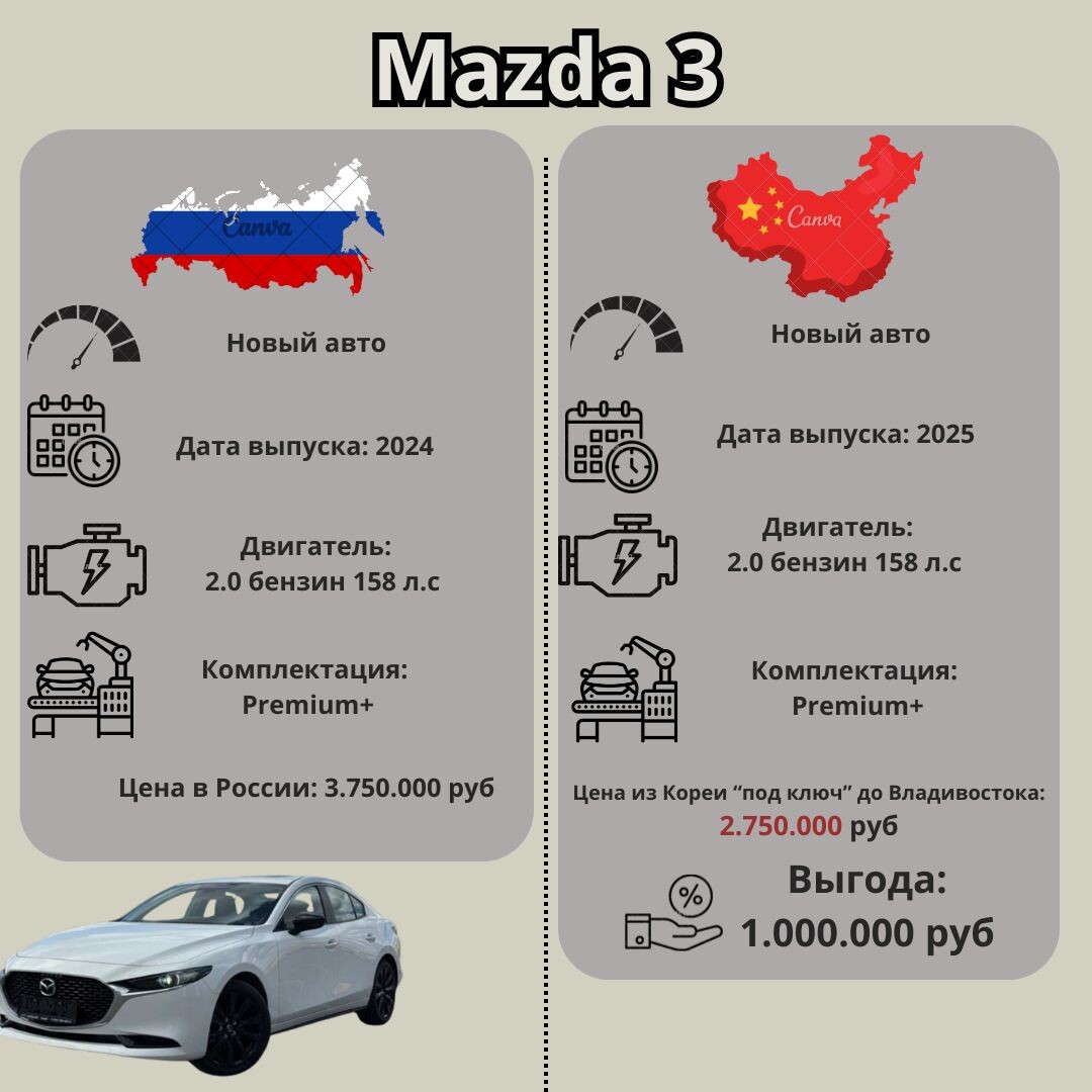🇨🇳 Mazda 3 из Китая против цены в России 🇷🇺 Новая Mazda 3 2.0 (158 л.с., Premium+) в России - 3 750 000 ₽. Объявление на авто.ру на машину в НАЛИЧИИ Та же машина из Китая — новая, 2025 года выпуска, в аналогичной комплектации — выходит всего 2 750 000 ₽ “под ключ” до Москвы. ⚡️ Выгода — 1 000 000 ₽ И это при том, что авто — абсолютно новое, с тем же мотором и уровнем оснащения. Если интересно, как заказать Mazda 3 (или любую другую машину до 160 л.с.) напрямую из Китая или Кореи — напиши мне, расскажу подробно 👉 @src_manager