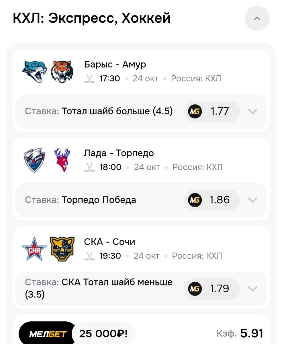 Экспресс на КХЛ ждали? Вот он 👇 ✅ Барыс-Амур Ставка: Тотал больше 4.5 шайб ТБ 4.5 шайб сыграл в 6 матчах команды Барыс подряд в КХЛ ✅ Лада-Торпедо Ставка: победа Торпедо Лада проигрывает в основное время в 8 из 9 последних очных встреч этих команд в КХЛ ✅ СКА-Сочи Ставка: СКА, Тотал меньше 3.5 шайб СКА забивает меньше 3.5 шайб в 9 матчах подряд в КХЛ