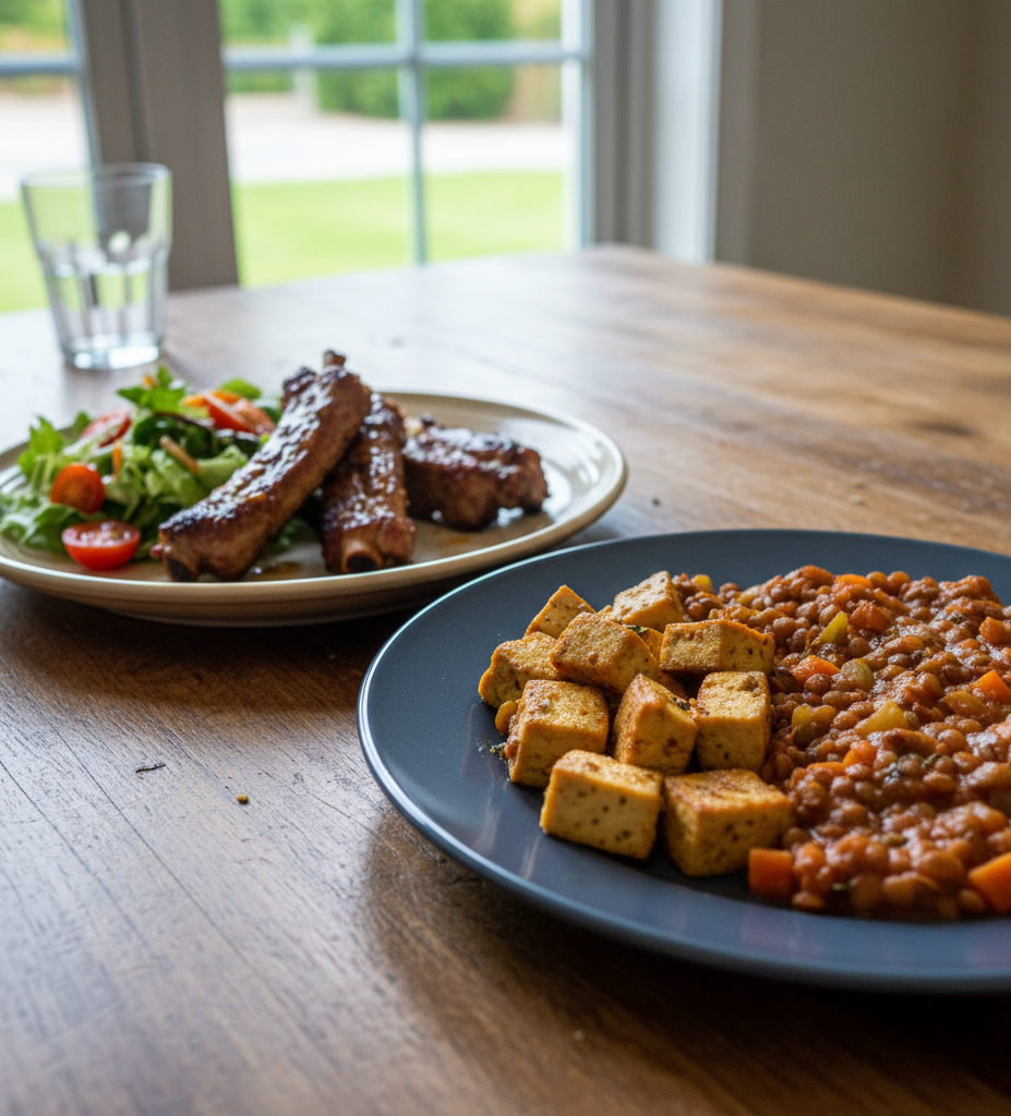 Привет. Я маркетолог, и последние несколько лет я вегетарианец. Моя супруга заядлая мясоедка, любит мясо, особенно рёбрышки и индейку, ну и рыбой не брезгует. И мы, конечно, живём вместе. Сразу скажу: мы никогда не ругались из-за еды. Я полностью принимаю её выбор, а она уважает моё вегетарианство. Но совместная готовка всё равно была головоломкой, особенно из-за моих ограничений. Мой список ограничений: строгое вегетарианство, нет яиц, рыбы и морепродуктов из-за аллергии. Её потребности: быстрый, качественный белок для поддержания спортивной формы и тонуса. Первое время мы просто готовили всё в двух экземплярах, но это было неудобно и дорого. Мы нашли выход! Разработали систему, которая позволяет нам есть вместе, вкусно, разнообразно и укладываться в бюджет. Рассказываю, как это работает. Мы не хотели тратить лишние деньги и время, но при этом нам обоим нужна была эффективная система питания. Мои задачи: обеспечить себя чистым, низкоаллергенным рационом, который даёт энергию для сидя