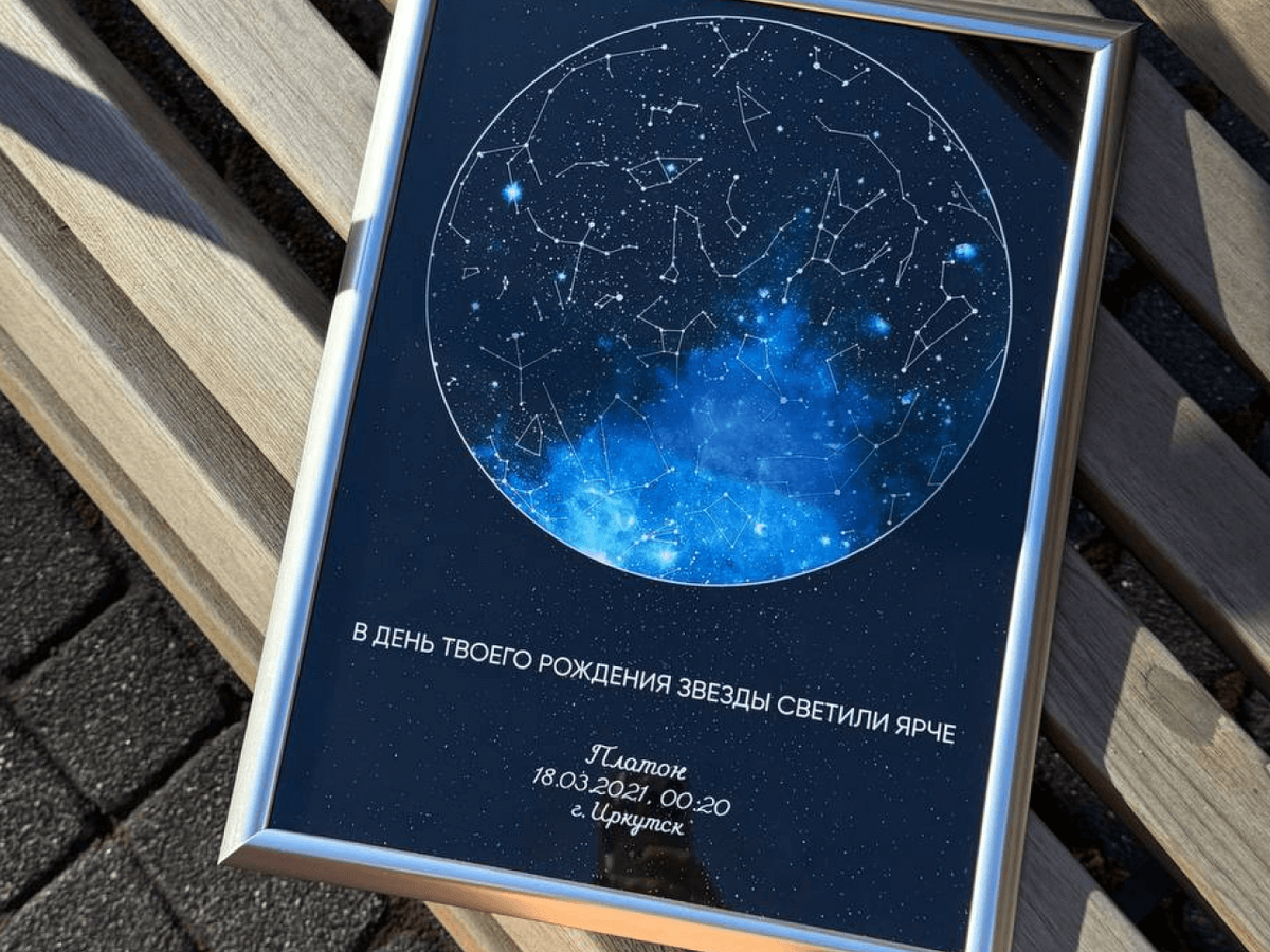 Карта звёздного неба по дате — это точное отображение расположения звёзд, планет и созвездий в определенный момент времени. Например, в день рождения, день свадьбы, день знакомства. Вы можете выбрать любое значимое для вас событие. Такая карта станет не только памятным подарком, но и прекрасным элементом интерьера. Когда вы смотрите на ночное небо, вы видите только часть Вселенной, доступную вашему местоположению и времени суток. Карта звёздного неба по дате — это визуализация этого неба, созданная на основе астрономических данных. На карте можно отобразить: Небо над нами меняется каждую секунду. Из-за вращения Земли звезды "передвигаются" по небосводу. Поэтому, чтобы получить точное изображение неба, нужно указать: 💡 Пример: 20 августа 2024 года, 21:00, Москва — небо в этот момент будет совершенно другим, чем, например, 20 августа в Лондоне. Создание звёздной карты — это не магия, а точный астрономический расчёт. Данные для звездной карты мы берем в специальной астрономической програ